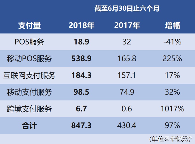 这个数据,其实是比整个第三方支付行业的成长还要高出一半以上的——根据Frost & Sullivan统计的行业数据,截至2018年底,中国第三方支付行业的支付交易总量预计将达到人民币225.3万亿元,较2017年上升47%。