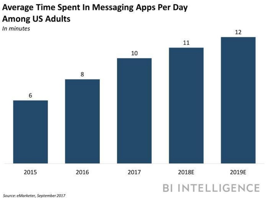据市场研究公司eMarketer的统计数据显示,去年,美国消费者平均每天在一款通讯应用上逗留的时间是10分钟,较2016年的8分钟增长了15.2%。这个平均逗留时间在今年有望增长到11分钟,在2019年有望增长到12分钟。