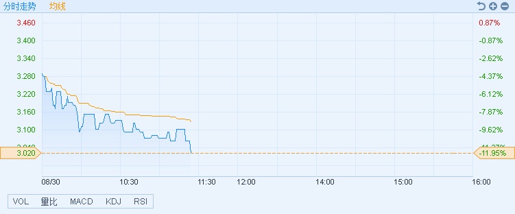 智通财经APP获悉,中国电力清洁能源(00735)昨日公布中期业绩,净利润同比下滑17.2%至1.45亿元人民币,股价下挫,截至11时23分,跌11.95%,报价3.02元,成交额1004.43万。