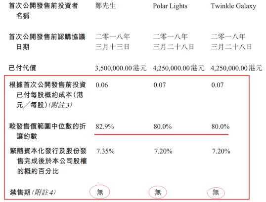 7、公司股权结构稳定,大股东占股53.25%。2018年新进入三名投资者,其中郑先生(郑志恒)是新世界集团及周大福创始人郑裕彤的次子的长子(也就是郑裕彤的孙子,但不是长孙),其他两人都跟公司有业务往来。这三人合计控制21.75%的股份,持股成本只有发行价区间中位数的20%左右,且没有限售期。如果行使发售量调整期,这三位大佬或许是不差钱的主,但是首日可流通股份占总股本的50%着实很吓人;4.5分
