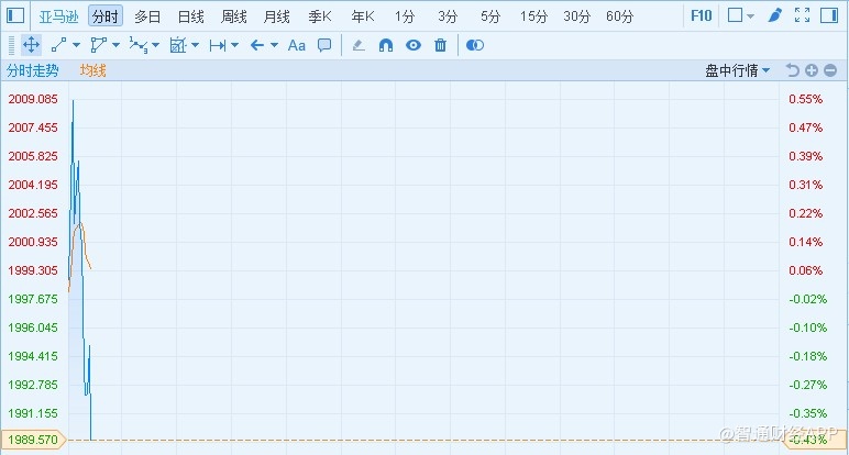 个股方面,亚马逊涨破2000美元整数位心理关口,高点曾超2009美元,创历史新高,市值达9779.5768亿美元。截至发稿,亚马逊股价出现短线跳水,现报1989.57美元,跌0.43%。