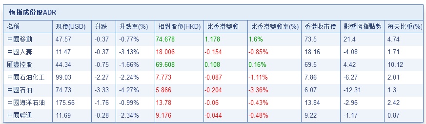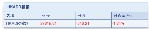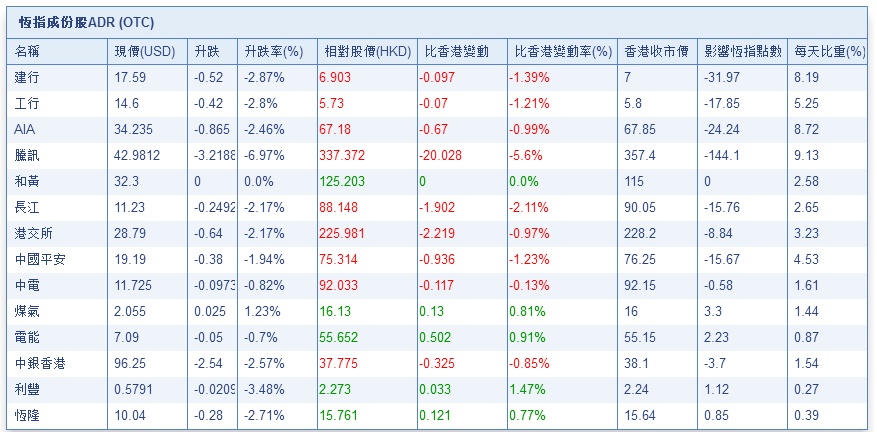 智通财经APP获悉,隔夜美股暴跌,港股ADR低开低走,按比例计算,收报27815.84点,跌384.21点或1.24%。蓝筹多数下跌,汇丰控股收报69.61元,较港收市微升0.11元;腾讯控股收报337.37元,较港收市跌20元,跌幅达5.6%。内银股普跌,建设银行收报6.903元,较港收市跌0.097元。香港公用股靠稳。
