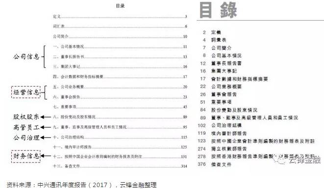 上市公司财报包括年报、半年报与季报三类,其中信息最丰富、经过严格审计的是年报。全球各市场的年报内容结构差异不大,主要包括公司信息、经营信息、股权股东、高管员工、公司治理与财务信息六大板块,我们以AH股中兴通讯(00763)为例,分别展示A股与港股上市公司的年报格式: