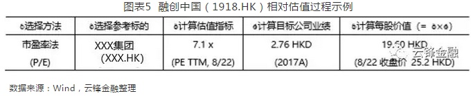相对估值计算过程很简单,用参考标的的估值指标乘以目标公司的业绩就能得到,估值指标包括市盈率(P/E)、市净率(P/B)、市销率(P/S)、价值倍数(EV/EBITDA)等。例如,若采用市盈率法为融创中国(01918)估值,可以选用可比公司XXX(XXX.HK)的市盈率,乘以融创中国当期的每股净利润(EPS),得到每股价值。