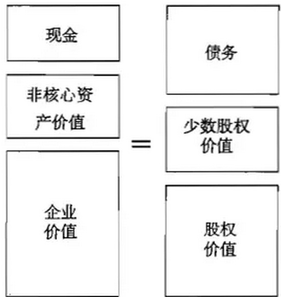 第五,得到公司价值后,还需要通过价值等式推出权益价值,权益价值除以股数就是每股权益价值,也就是分析师们的“目标价”。价值等式如图表9所示,这里隐含着一个默认的逻辑:既然公司价值由未来赚到的钱决定,那么这些未来所赚的钱折现后得到的并不是全部资产的价值,而是“能赚钱的”资产的价值,即核心资产价值,现金和非核心资产不被计算在内。折现得到的核心资产价值需加上现金与非核心资产价值,再减去(付息)债务与少数股权价值,才能得到权益价值。