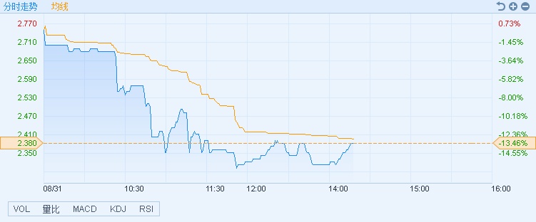 智通财经APP获悉,西藏水资源(01115)昨日公布中期业绩,毛利率下滑,股价重挫,截至14时16分,跌13.45%,报价2.38港元,成交额2227.87万。