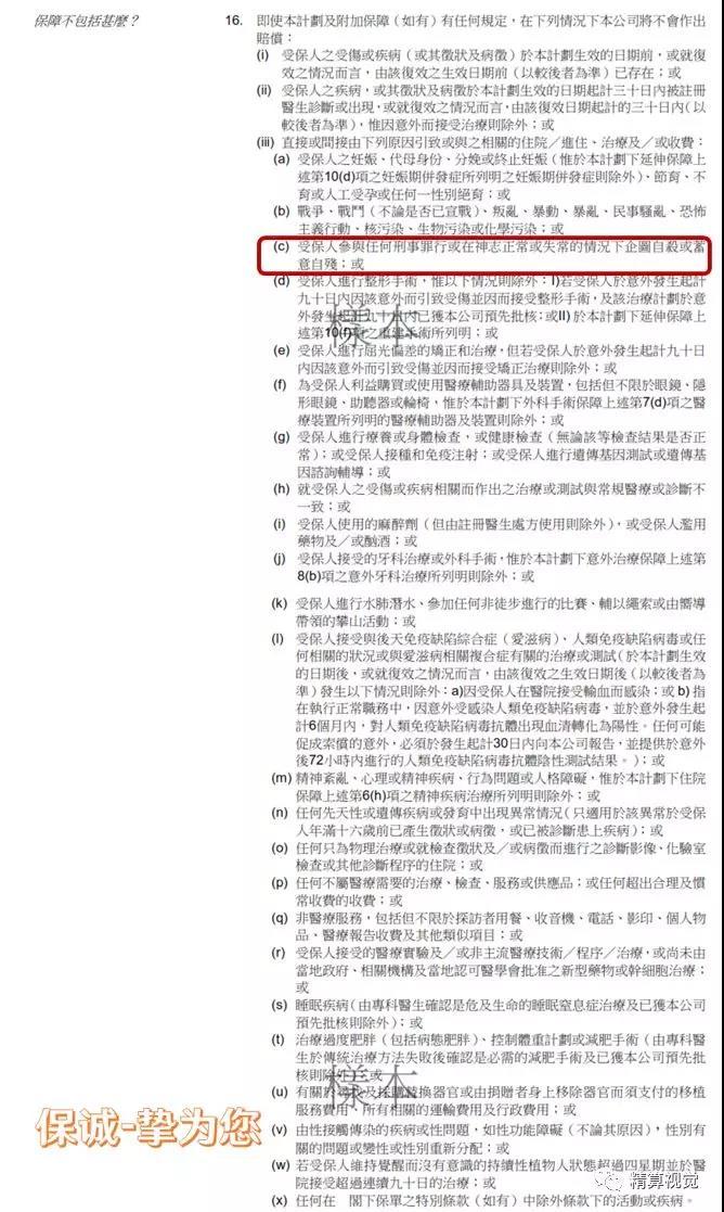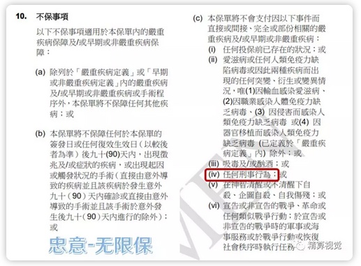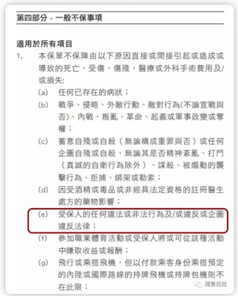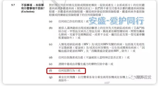 不过,本着谨慎的原则,我还是花了一点时间,研究了一下香港各大保险公司不同险种的免责条款(香港叫“不保事项”),主要关注了“犯罪所导致的身故或疾病是否属于保险的免责事项”。今天的文章,就给大家简要介绍一下。