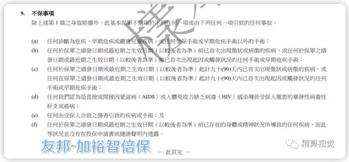 在保险条款的免责方面,我一直认为香港保险要比内地宽松一些,毕竟香港保险市场更加成熟,“道德风险”较小,也不会被法律强制要求加上一些如内地《保险法》中规定的“法定免责事由”(注:主要涉及1. 违反告知义务、2. 保险欺诈、3. 故意行为、4. 自杀行为、5. 犯罪行为)。