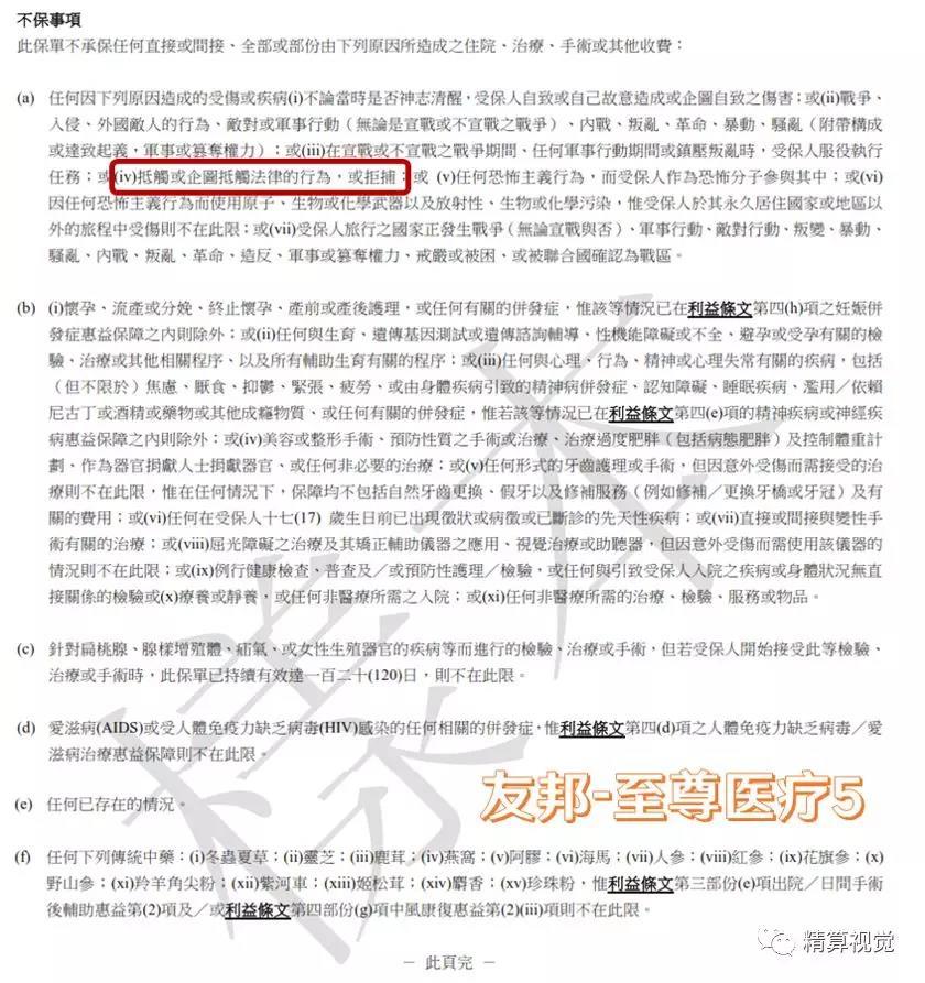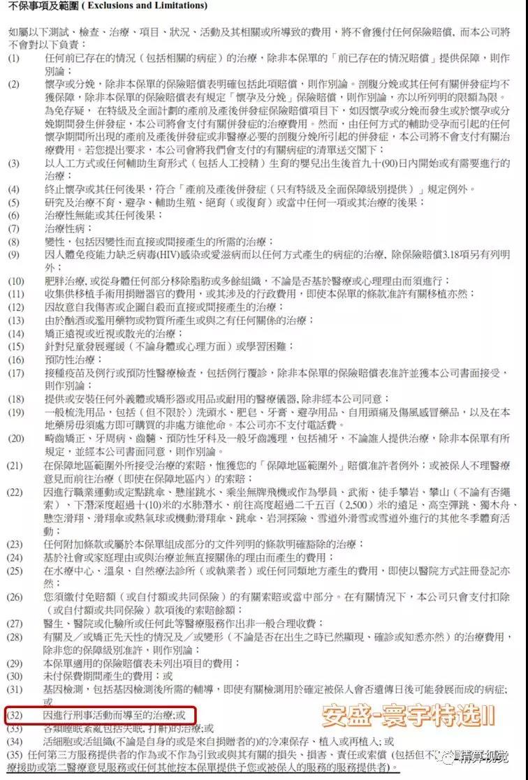 由于香港的医疗险以高端医疗险为主,保障责任很全,涉及到医疗过程的方方面面,因此除外条款设置较为复杂,文字很多,在这里就不拆开细讲。我大致翻看了几个产品,发现香港绝大多数医疗险对于犯罪行为所导致的医疗费用赔偿也是免责的。