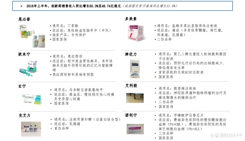 产品方面,恩必普可能是石药最重磅的产品,它是国家一类新药,主要成分是丁苯酞。主要用于缺血性脑卒中,目前有两种剂型:软胶囊和注射制剂,现已全部进入中国国家医保。其中,注射制剂自2017年进入国家医保后,销量不断上升,上半年其销售额首次超过了软胶囊。该产品去年全年整体销售额达到35亿港元左右,希望今年可以创新高。