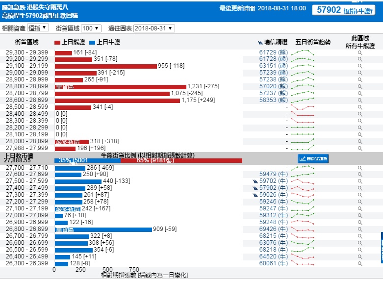 智通财经APP获悉,截至8月31日,恒指最新的牛熊街货比例为35:65。从瑞信恒指牛熊证街货分布图中得到的数据显示,熊证街货重货区在28800-28899区间,该区间熊证数量为1231张,比上一交易日减少275张;最多新增在28000-28099区间,新增318张。牛证中重货区在26800-26899区间,该区间最新牛证数量为909张,比上一交易日减少59张;最多新增区间在27100-27199区间,新增167张。
