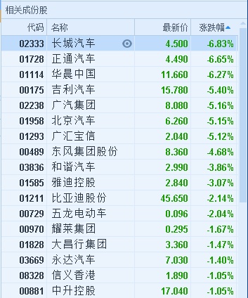 智通财经APP获悉,汽车板块全线下挫,截至10时44分,长城汽车(02333)跌6.83%,报价4.5港元,正通汽车(01728)跌6.65%,报价4.49港元,华晨中国(01114)跌6.27%,报11.66港元,吉利汽车(00175)跌5.4%,报15.78港元,北京汽车(01958)跌5.15%,报6.26港元,东风集团(00489)跌4.68%,报8.36港元。