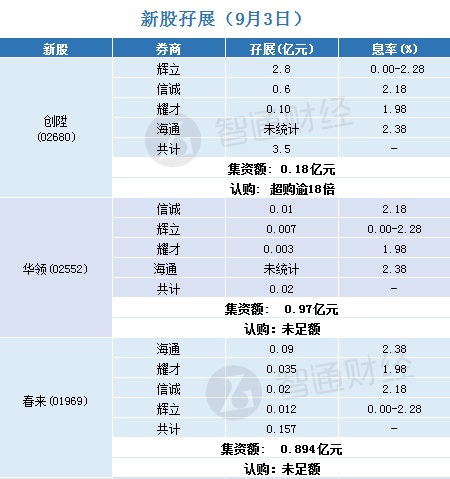 截至9月3日,辉立、耀才等为创陞(02680)借出孖展3.5亿孖展金,超购逾18倍;为华领(02552)借出0.02亿孖展金,未足额;为春来(01969)借出0.157亿孖展金,未足额;