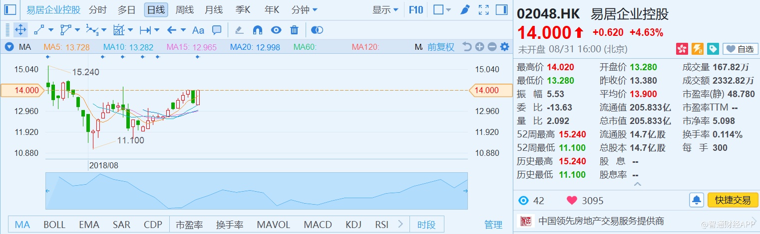 中国房地产行业正站在拐点上,行业集中度将进一步提升,存量市场成为各路资本的新战场,“服务生”易居在资源及战略布局上已做好充分准备,上半年的成绩或许只是新的起点。8月31日,易居股价收涨4.63%,报14港元。