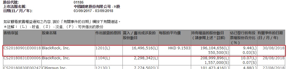 智通财经APP获悉,根据联交所资料显示,贝莱德于8月30日减持中国铁建(01186)1649万股,每股作价9.1503元,总值1.51亿元,最新持股量降至9.44%。