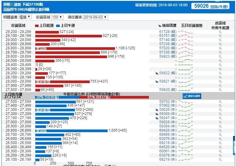 智通财经APP获悉,截至9月3日,恒指最新的牛熊街货比例为39:61。从瑞信恒指牛熊证街货分布图中得到的数据显示,熊证街货重货区在28000-28099区间,该区间熊证数量为755张,比上一交易日增加437张;最多新增在28000-28099区间,新增437张。牛证中重货区在26800-26899区间,该区间最新牛证数量为1005张,比上一交易日增加95张;最多新增区间在27300-27399区间,新增289张。