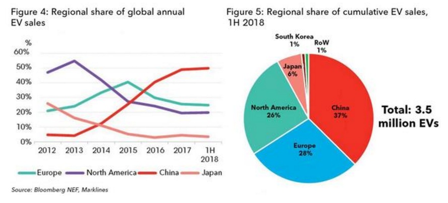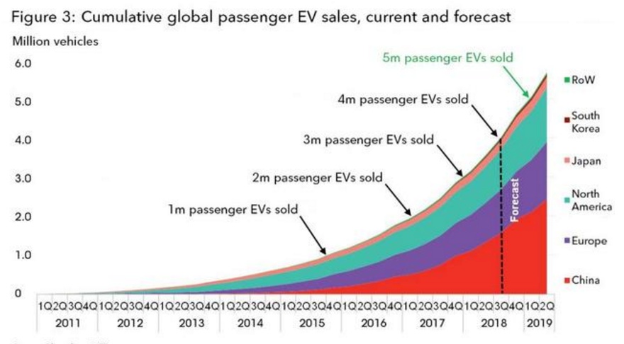 预计全球电动车累计销量突破500万仅需6个月时间,即到2019年3月份。未来电动车销量的增长约42%的份额将会来自中国市场,而欧洲和北美则将分别贡献26%和25%。