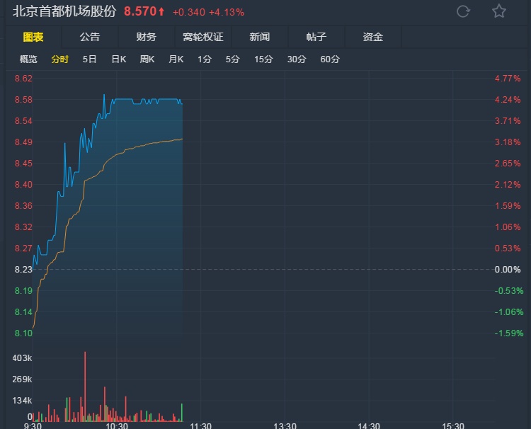截至发稿,首都机场(00694)股价报8.57港元,升4.13%。