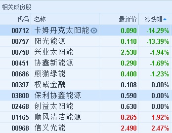 智通财经APP获悉,多只炒高的光伏股今日显着回吐,截至11时53分,卡姆丹克太阳能(00712)跌14.29%,报价0.09港元,阳光能源(00757)跌13.39%,报0.11港元。