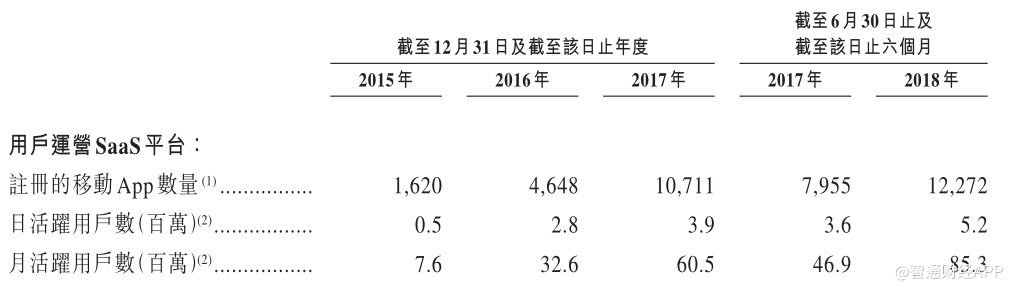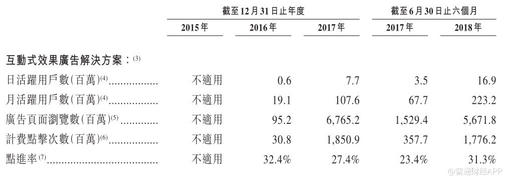 截至2017年12月31日,在中国日活跃用户数目于2017年12月排名前100名的移动App中,有52%使用兑吧用户运营SaaS平台。截至2018年6月30日止六个月,互动式效果广告业务服务的终端广告主(通过广告代理客户或直接客户)为1750名,月活跃用户数为223.2百万人,日活跃用户数为16.9百万人,广告页面浏览量为5671.8百万次。