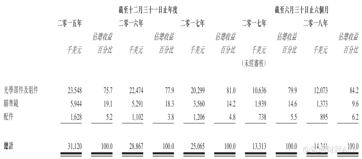 华奕科技的主要业务是向客户供应定制精密光学产品,包括光学部件及组件,例如透镜、稜镜及光学组件,而客户应用高精密光学元件至其最终产品;以及瞄准镜,例如双筒望远镜及观测镜等。同时,公司还供应转接环及接口等配件。下表载列往绩期间销售所得的收益: