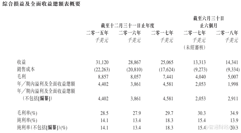 财务方面,截至2017年12月31日3个年度,公司总收益减少约19.5%,主要由于2015财政年度至2017财政年度光学部件及组件销售所得收益减少以及瞄准镜销售收益减少,而有关减少主要由于光学组件客户订单减少,以及观测镜客户订单减少所致。但截至2018年6月30日较2017年同期增加约7.7%,主要由于德国客户及其他国家的新客户下达的光学部件及组件销售订单增加,但被双筒望远镜的销售订单减少部分抵销。
