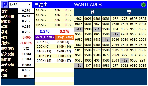 智通财经APP获悉,物流服务商万励达(08482)将于下一交易日挂牌,上市前夕,据辉立交易场资料显示,万励达暗盘开市报0.265元,较招股价0.275元低0.01元。收报0.27元,每手10000股,不计手续费,每手亏50元。