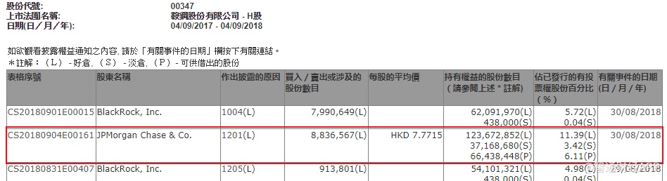 智通财经APP获悉,根据联交所资料显示,摩根大通于8月30日减持鞍钢股份(00347)884万股,每股作价7.7715元,总值6867万元,最新持股量降至11.39%。