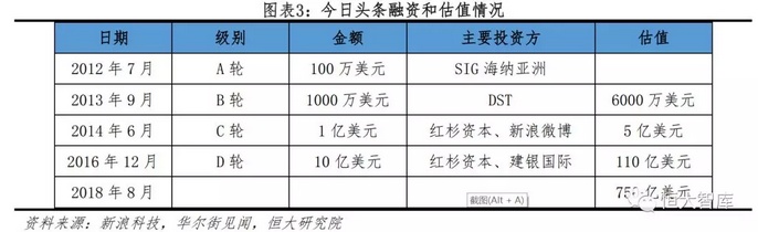 用户数量的激增带动了今日头条的融资与估值。从2012年7月到2016年12月,今日头条共进行了4轮融资,A轮、B轮的融资金额仅为100万和1000万美元,而2016年12月的融资额已经达到了10亿美元,估值超过100亿美元。根据华尔街见闻的报道,今日头条在2018年8月启动了新一轮融资,预计估值将达到750亿美元,这一估值将超越滴滴出行和美团,成为仅次于蚂蚁金服的国内非上市企业。