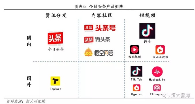 抖音、火山小视频和西瓜视频面向了国内主战场,不同产品的目标群体和内容生产方式互补,“PGC+UGC+音乐”组合形成了完整的产业布局: