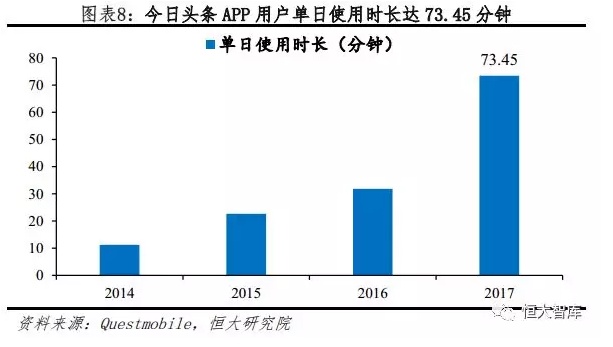 纵向比较:今日头条APP月活跃用户从2016年5月的8288万人增至2018年6月的2.68亿人。换而言之,中国每10个人中就有约3个今日头条APP的用户。用户使用时长从2014年的11.23分钟增长至2017年的73.45分钟。