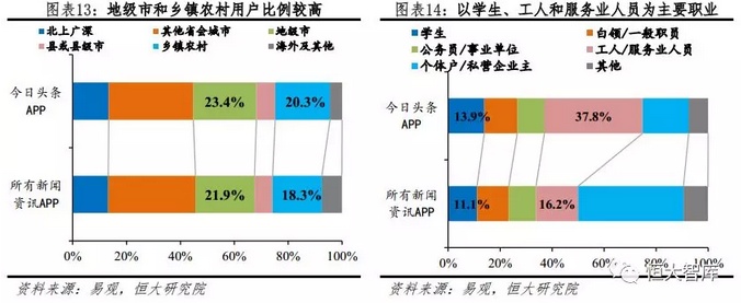 智能分发提供“千人千面”资讯信息,直击移动时代阅读需求。沉浸式阅读使编辑精选的优质内容颇受欢迎,即“人”找“信息”;浅阅读时代,用户在阅读前通常没有明确的目标,阅读兼有打发时间的功能,因而出现了“信息”找“人”的市场需求。今日头条APP的智能分发正是以上述需求为切入点,它也是最早推出新闻资讯智能分发的APP,当用户使用微博、QQ登陆今日头条APP,它的数据挖掘系统能在5秒内计算出用户的兴趣画像,且用户的点击、阅读动作后系统会在10秒内更新模型,用户下拉即能为用户更新个性化信息,使用户在任何场景都能接收到有价值、符合其兴趣的信息。今日头条APP的用户画像也的确契合于“浅阅读”消费者特征:低收入的年轻群体,分布于地级市或乡镇,以学生、工人和服务业人员为主要职业。