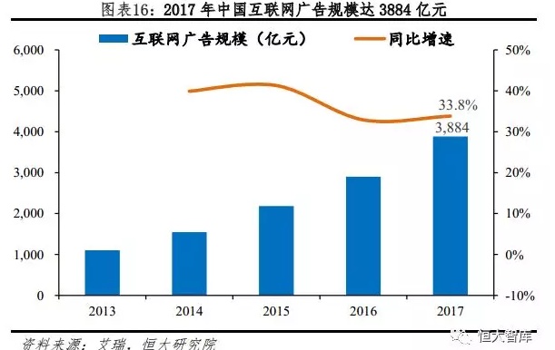 互联网广告市场规模大:2017年中国互联网广告规模达到了3884亿元,远高于网络游戏和在线视频用户付费的市场规模。