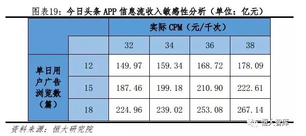信息流广告收入模型:DAU×单日用户广告浏览量×CPM×365。极光大数据显示,2018年6月今日头条APP的DAU为1.07亿。笔者测算部分数据:(1)使用时通常每4-5分钟会下拉刷新一次信息流。(2)每次刷新会出现0-2条广告,假设广告加载率取1篇。今日头条官方数据显示,今日头条APP单日用户使用时长为74分钟,因此单日用户广告浏览数为12-18篇。CPM刊例价为180元/千次,根据投放金额不同,折扣率为0.18-0.21,因此实际CPM为32-38元/千次。基于上述数据,2018年今日头条APP信息流广告收入为149.97-267.14亿元,中值约205亿元。