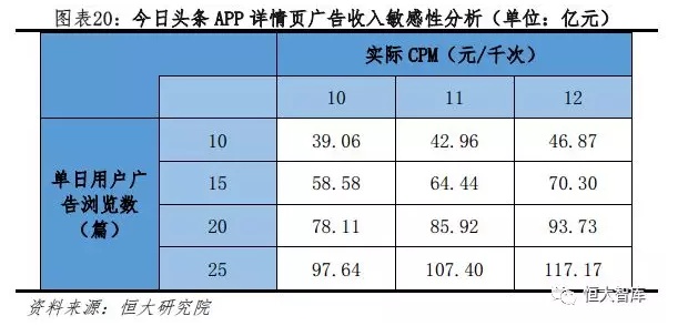 详情页广告收入模型:DAU×单日用户广告浏览量×CPM×365。根据笔者实测:(1)通常每10分钟会阅读2-3篇资讯,74分钟使用时长可阅读10-25篇资讯。(2)几乎每篇资讯均附有详情页广告,广告加载率取1篇。因此,单日用户广告浏览数为10-25篇。详情页广告的CPM刊例价为60元/千次,折扣率为0.18-0.21,因此实际CPM为10-12元/千次。基于上述数据,2018年今日头条APP详情页广告收入为39.06-117.17亿元,中值约75亿元。