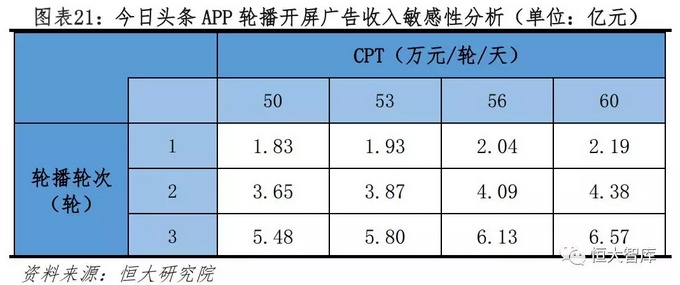 开屏广告收入模型:单日轮次×CPT×365。首刷开屏广告CPT刊例价为1100万元/轮/天,折扣率为0.18-0.21,首刷实际CPT为200-230万元/轮/天,因此首刷开屏广告收入为7.3-8.4亿元。轮播CPT刊例价为280万元,折扣率为0.18-0.21,因此轮播实际CPT为50-60万元/轮/天。根据笔者实测,今日头条APP开屏广告的单日总轮次为2-4轮。加总首刷和轮播开屏广告收入可得今日头条开屏广告收入为9.13-14.97亿元,中间值约12亿元。