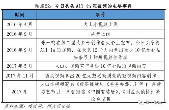 2016年,今日头条将战略重心从资讯分发转向短视频,不仅推出了“抖音+火山小视频+西瓜视频”产品矩阵,而且拿出了巨额补贴。2016年9月,今日头条上线了抖音,并且宣布将All in短视频,拿出10亿补贴头条号上的短视频创作者。2017年5月,今日头条旗下的火山小视频宣布将拿出10亿补贴短视频内容,并且对内容达人推出养成计划,进行长期流量扶持。此外,火山小视频、抖音在2017年分别冠名了10多款综艺节目,包括头部综艺《极限挑战》和《中国有嘻哈》。