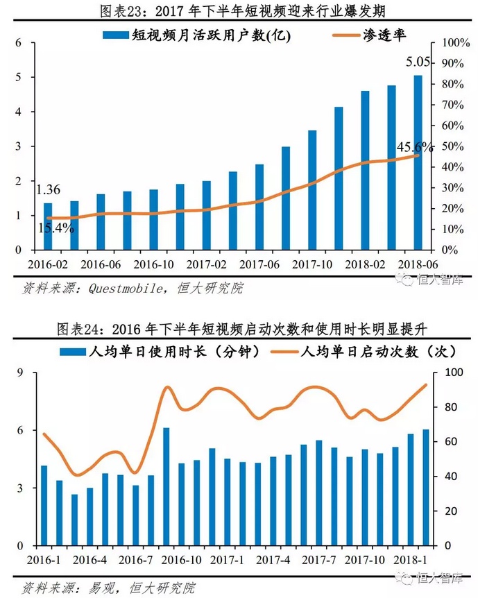今日头条的短视频战略踩准了行业发展的风口,在群雄混战的行业窗口期精准切入,巨额的补贴计划和营销投入使其在众多短视频应用中脱颖而出,成功收割2017年6月至今的短视频流量红利。2017年下半年是短视频月活跃用户增长井喷时期,截止2018年6月短视频行业活跃用户数突破5亿,相比2017年同比增长104%。截至2018年6月,短视频应用渗透率达46%,即近半数网民成为短视频用户。