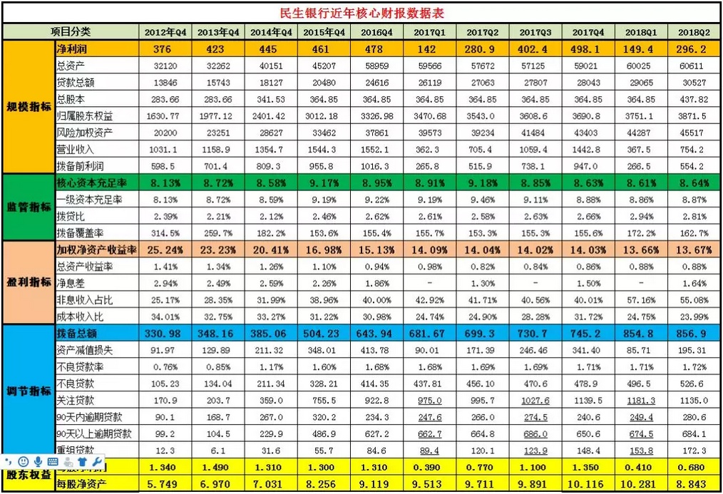 总体评价:民生银行(01988)2018年中报还是很一般,各方面表现都不算好,净息差的改善更多的是去年基数太低,也就是去年太弱了。去年的新生不良出现了拐点,但今年新生不良又增加了不少,而且拨备方面也看到下滑了一些。值得期待的地方是三季度利率开始大幅下行,这对民生银行是个好消息,下半年的数据应该会好不少,如果要找亮点的话,那就是民生银行的估值太低了,尤其是港股的估值不断创历史新低,其投资价值还是非常罕见的。