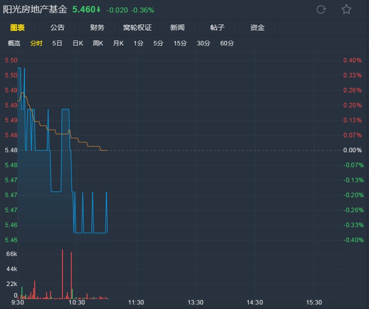 截至发稿,阳光房产基金报5.46港元,跌0.36%。