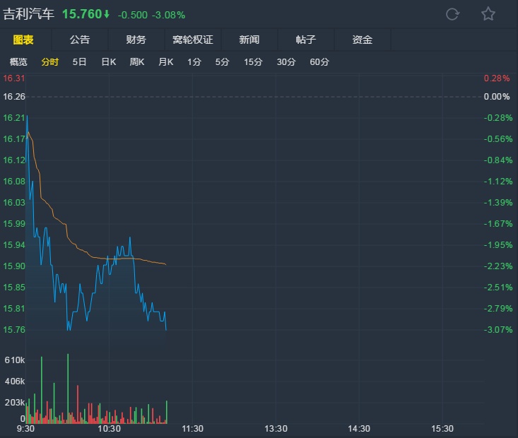 截至发稿,吉利报15.7港元,跌3.08%。