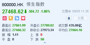 智通财经APP获悉,担忧贸易摩擦升级,恒生指数截至11时36分,跌1.8%或504.72点,报价27468.62点,成交额435.08亿。国企指数跌1.69%,报10706.97点。红筹指数跌0.63%,报1063.697点。