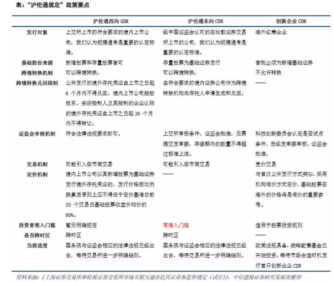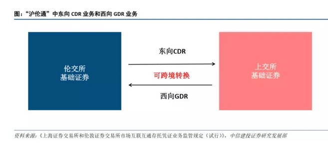 2018 年 8 月 31 日,证监会起草了《上海证券交易所和伦敦证券交易所市场互联互通存托凭证业务监管规 定(试行)》(以下简称“沪伦通规定”),并就沪伦通规定公开征求意见。沪伦通规则共 30 条,就上交所与伦交 所市场互联互通存托凭证业务中的发行、交易、跨境转换和信息披露等行为提供依据。 沪伦通存托凭证业务可以划分为东西两个方向的业务。西向 GDR 是指符合条件的在上交所上市的境内上市 公司发行境外存托凭证并在伦交所上市,东向 CDR 是指符合条件的在伦交所上市的境外基础证券发行人发行中 国存托凭证并在上交所上市。同时东向 CDR 须为中国证监会认可的在伦交所上市的公司。而创新企业 CDR 发行 对象为海外红筹企业。