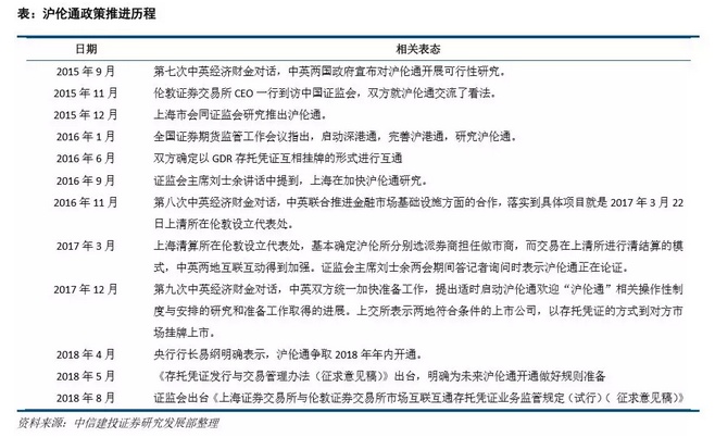 自 2015 年以来,沪伦通的政策探讨不断升温,当前已经处于解决技术细节、制定落地规则的阶段,官方表态争取今年开通。沪伦通作为中国与境外的首个股市联通计划,将实现上海证券交易所和伦敦证券交易所的互联互通,2015 年 9 月在中英经济财金对话上,时任英国财政大臣奥斯本发表了对于沪伦通开始进行可行性研 究的公开言论,中英两国政府就宣布启动“沪伦通”可行性研究。从去年开始,沪伦通“通车”的预期不断升 温。据第一财经报道,相关人士透露中英双方都有强烈意愿推动‘沪伦通’,英国会选择一批顶级的上市公司 提供给中国投资者在中国交易时段交易,伦交所会选派一些券商担任做市商,交易在上海进行清算、结算;反 之亦然。在 2017 年第九次中英经济财经对话中,中英开始进一步推进一些细节性工作,并同意中英监管机构在 “沪伦通”框架下就跨境证券监管执法合作、会计准则与审计监管达成相关合作安排。