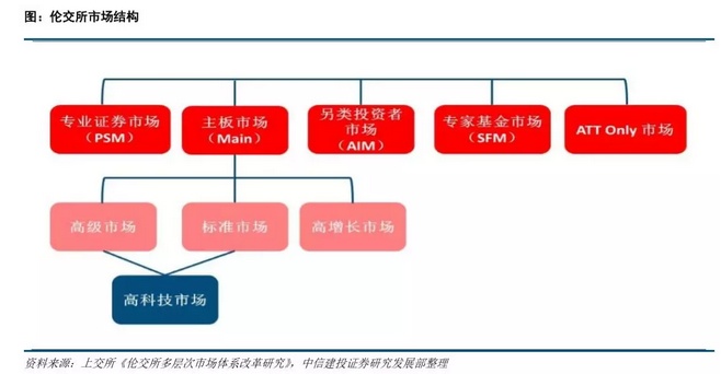 伦交所针对不同市场结构形成了多层次的上市、交易与监管机制,以 Main 市场为主,AIM 市场则主要针 对全球中小型企业的融资。伦交所有四大主要市场:主板市场(Main Market)、 另类投资者市场(Alternative Investment Market,以下简称 AIM 市场)、专业投资者市场(Professional Securities Market,以下简称 PSM 市场) 与专家基金市场(Specialist Fund Market,以下简称 SFM 市场)。在四大主要市场外,伦交所还开设了 Admission To Trading Only 子市场(以下简称 ATT Only 市场)。