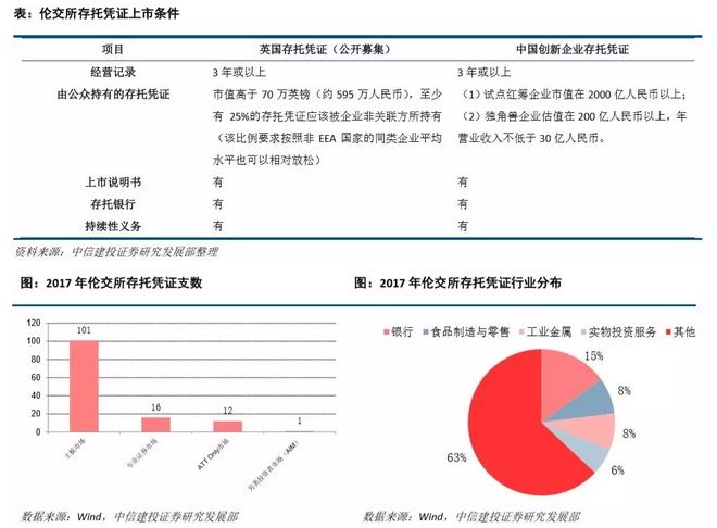 英国金融市场行为监管局(Financial Conduct Authority,FCA)以及英国金融服务管理局(Financial Service Authority,FSA)对于在伦敦交易所申请上市存托凭证的企业已有一套较为完善的制度规定,存托凭证要求。企业发行存托凭证的方式可以为公开募集、非募集上市或定向募集。对于公开发行存托凭证的制度要求最为严格 ——要求企业公布符合 FCA《上市说明书细则》的上市说明书、提供最近三年的经审计的财务报告和业绩记录、 在存托凭证市场的市值高于 70 万英镑(约 595 万人民币)并且要求至少有 25%的存托凭证应该被企业非关联方 所持有(该比例要求按照非 EEA 国家的同类企业平均水平也可以相对放松)。根据 2017 年伦交所上市公司交易 数据,伦交所主板上市交易的 DR 有 101 支,专业证券市场上市的 DR 有 16 支,ATT Only 市场(Admission to trading only)中上市的 DR 有 12 支,另类投资者市场(AIM)上市的 DR 有 1 支,综上总计 130 支 DR 在伦交所上市。 其行业分布主要为银行(15%)、食品制造与零售(8%)、工业金属(8%)、实物投资服务(6%)等传统行业。 其国家和地区分布主要来自俄罗斯(东欧)、罗马尼亚(东欧)、埃及(非洲东北部)、中国台湾(亚洲)、印度 (南亚)、塞浦路斯(亚欧非交界)等。