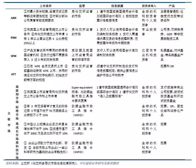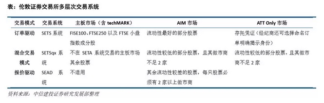 伦敦交易所有着丰富的多层次交易系统。其中,AIM 市场成立于 1995 年 6 月,是伦交所的创业板市场,主 要定位于满足小型的、新兴的 IPO 和後续持续融资需求;PSM 市场设立于 2005 年,该市场仅面向专业投资者, 采用机构发行的方式发行各类金融产品,发行人大多来自亚非新兴市场,多为金融和工业类企业;SFM 市场则 成立于 2011 年,是仅向专业机构开放的基金市场,包括私募基金、联接基金、对冲基金等,有着以境外金融机 构为主的发行人结构;ATT Only 市场主要为已在其他交易所(必须是 WFE 成员)上市的证券提供有限的交易平 台,一方面,该市场服务于未来期望在伦交所上市,但现阶段不符合其他版块上市条件的企业,另一方面服务 与受限于企业所在国法律约束或企业自身影响,不能在伦交所正式上市的企业。