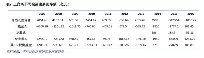 对比来看,我国上交所交易者结构中,个人投资者不论从交易账户数量还是净交易额角度来讲都占绝大多数。截至 2016 年,上交所投资者买卖净额数据显示,自然人投资者净卖出 1896 亿元,一般法人买入 210 亿元, 沪股通买入 455 亿元,专业机构买入 1231 亿元,其中自然人投资者交易净额占比超过 85%。