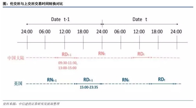 与中国大陆相比,伦交所交易时间更长,且两个地区交易时间基本无重叠,两地结算窗口不同步,这使得 沪伦通的结算成为最大的问题。具体而言,伦交所的交易时间为每周的工作日,其中 8:00-16:35 为正常交易时 间,7:50-8:00 为开盘集合竞价时段,12:00-12:02 为周期性集合竞价时段,16:30-16:35 为收盘集合竞价委托时段。 以 SETS 交易系统为例,平安夜、年末、SET0SET1 子系统每月第 3 个周五,以及 STMM 子系统 3/6/9/12 月的第 3 个周五,时间安排上略有改动。上交所交易时间为每工作日的 9:30-11:30 和 13:00-15:00,共计 4 小时,中国大 陆与英国交易时间并不重叠。港股通交易时间遵循联交所规定,并与港股交易时间一致,即 9:00-9:30 为集合竞 价时段,9:30-12:00,13:00-16:00 为连续竞价时段。与陆股市场相差不多的交易时段安排,使得双方市场结算清 算时间容易协调与安排。然而上海与伦敦分处不同的时区,上海闭市的时间,恰是伦敦开市时间,由于时差的 存在,两地结算窗口并不同步,这一问题给沪伦通的结算与清算安排提出了挑战。目前,针对时差障碍,使用 存托凭证工具可能成为突破口。2017 年 12 月中英经济财金对话中上交所提到两地符合条件的上市公司,以存 托凭证的方式到对方市场挂牌上市。如此,两地即可在当地市场的交易时间段中使用对方的存托凭证进行交易, 两地时差障碍导致的各种问题将得到初步的解决。
