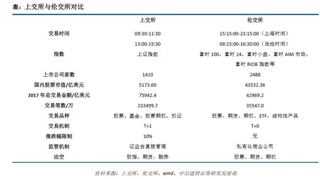 与沪港通、深港通不同,上交所与伦交所在语言、交易时间、开放程度、市场制度及法律层面存在诸多差 异,存托凭证(DR)则成为解决二者之间障碍的最可行方法。伦交所与上交所无论是交易规则、监管制度、市 场基础设施等都存在着较大的差异,这为沪伦通的政策制定带来挑战。特别是伦交所实行 T+0 交易机制和 T+2 的交割机制,并对个股每日涨跌幅度不设限。对于股票的异常价格波动,伦交所在盘中设置动态及静态价格稳 定措施,个股股价变动超过标准幅度的暂缓撮合 1 分钟。而 A 股实行 T+1 交易机制与每日 10%涨跌停限制。上 述及其他交易规则、监管制度、市场基础设施差异,不论对双方市场的制度设计者、投资者、中介机构还是监 督者而言都是不小的挑战。但鉴于港股市场交易规则等同样与 A 股差异较大,陆港通的实施和运作已使得我们 积累了一定经验。两地交易所已于 2017 年底完成了“沪伦通”的可行性研究报告并上报两国政府和监管机构。 沪伦两所认为,存托凭证适合于在时区不同、开放程度和市场制度差异较大的两个股票市场之间实现互联互通, 其业务模式成熟,商业可行性较强,实施难度较低,总体风险可控,便于保护两地投资者,有利于扩大中国资 本市场双向开放和中英两国资本市场合作。